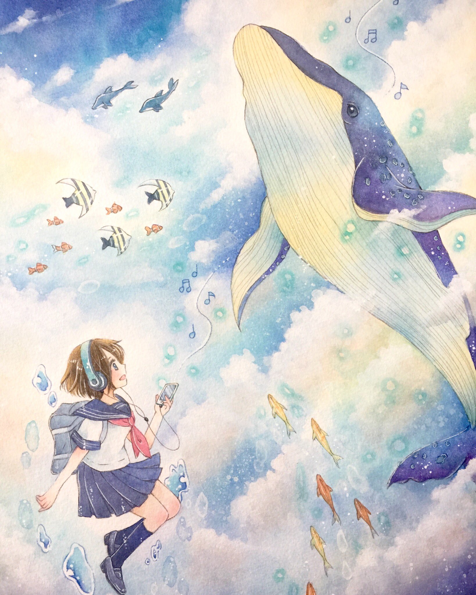 森ノ綾 来年に向けて色々準備中 海の空 別の世界観を描いてみたら 視野を広げるような気がするんだね 透明水彩 イラスト 魚 アナログイラスト 女の子イラスト クジライラスト T Co Xbki2xnwhx Twitter